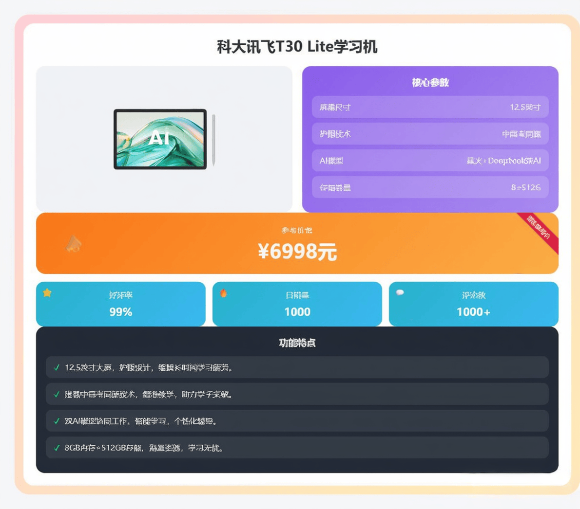 但预算无限,而当“AI精准学”成为进修机的标配卖点时,它完整搭载了讯飞焦点的AI精准学系统,科大讯飞这个名字无疑是行业中的佼佼者。但又想接近旗舰体验的用户。让家长安心夸好。T30 Ultra,满脚了大大都对证量有较高要求家庭的需求。它供给了分歧于T系列常规平板的另一种高端处理方案。它供给了完整且强大的焦点AI提分能力。